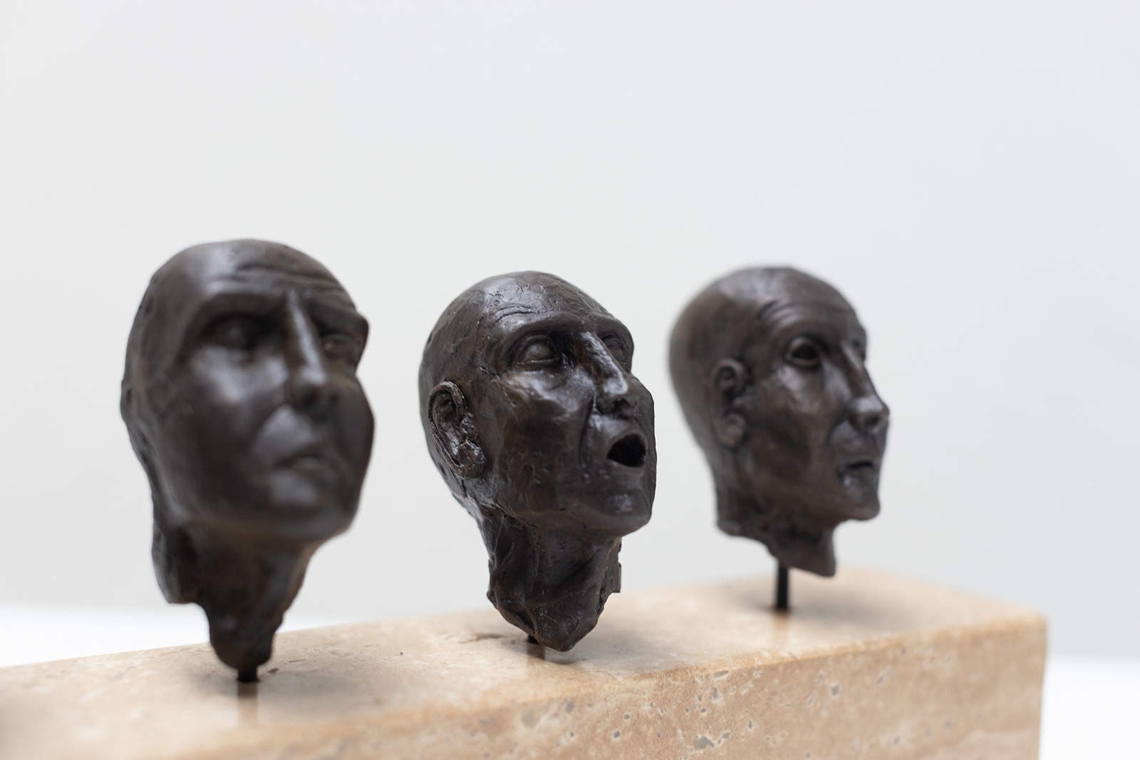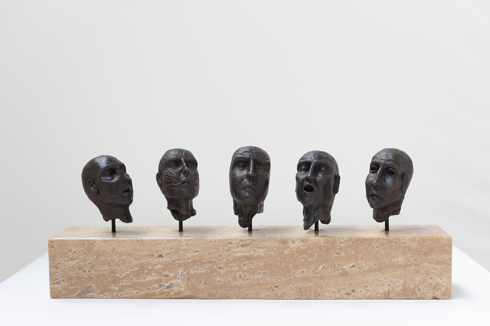 Bronce y mármol · Pieza única · 16 × 40 × 7 cm · 20155 Reyes presenta una secuencia de cinco cabezas de bronce suspendidas sobre una base de mármol, figuras que encarnan la pérdida simbólica de los sentidos: ageusia, anosmia, ceguera, sordera y anafia. Cada una de ellas, marcada por una expresión distinta y por diferentes grados de desgaste o exposición anatómica, revela un rostro del poder contemporáneo: autoridades que gobiernan sin sentir, sin escuchar, sin oler, sin saborear, sin tocar. Un poder desconectado de aquello que lo legitima: la experiencia humana.