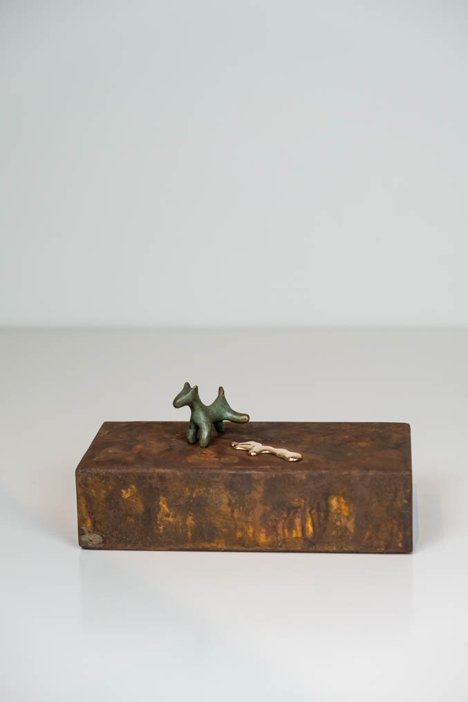 El personaje principal —un pequeño perro modelado en bronce, reducido a su mínima esencia— se apoya sobre una base maciza de hierro oxidado, creando un contraste deliberado entre la