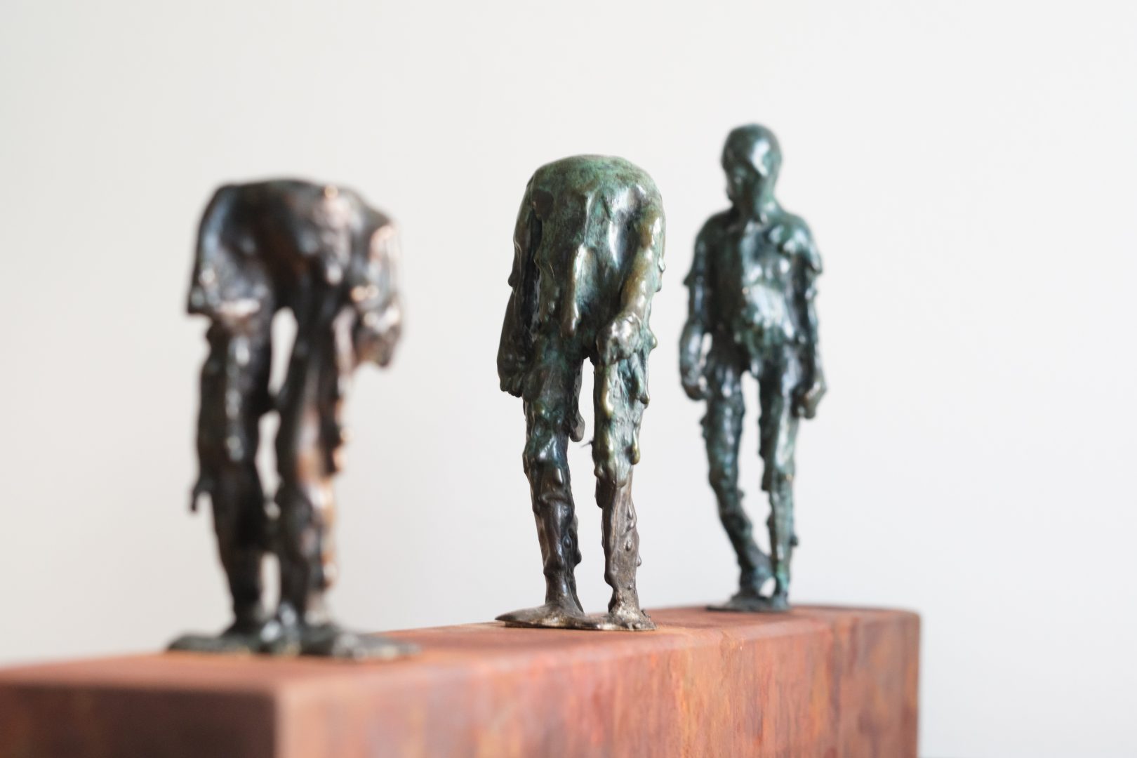 La pieza se alza sobre una base de hierro oxidado que refuerza su concepto: la materia se transforma, se deteriora y vuelve a nacer. Cada figura encarna un estado distinto de desgaste, recordándonos la fragilidad del cuerpo frente a la fuerza inevitable del tiempo.