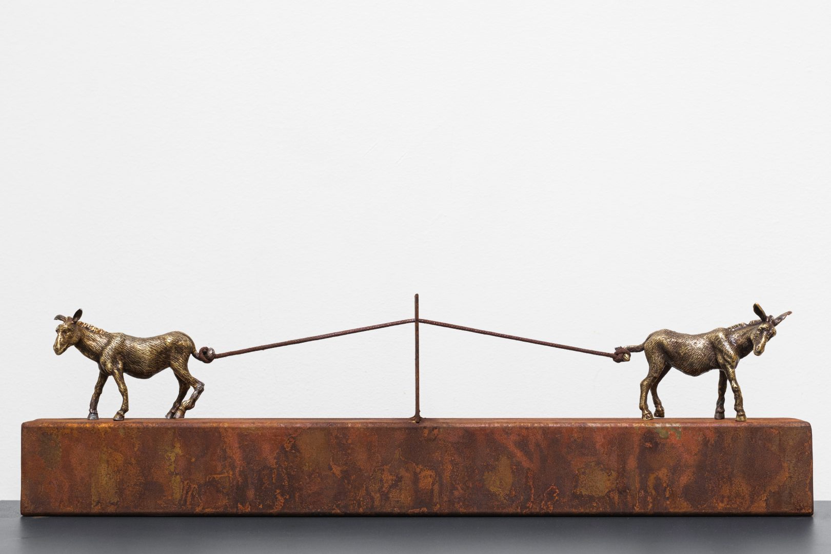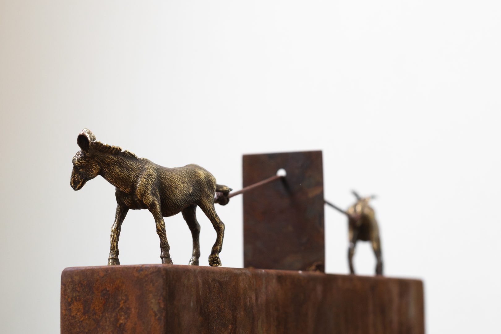 “Burros” es una obra creada en 2025 que invita a la libre interpretación del espectador. Dos burros de bronce, unidos por una sencilla estructura metálica sobre una base de hierro, generan una escena abierta, en la que cada persona puede proyectar su propia lectura según su visión, experiencia y sensibilidad.