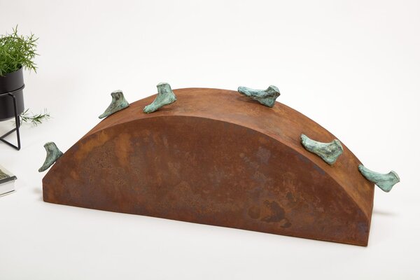 “Cruzando Puentes” es una obra que representa el viaje del alma a través del cambio, el movimiento y el esfuerzo necesarios para avanzar hacia una nueva fase vital. Sobre una base de hierro con forma de puente, múltiples pies de bronce se deslizan y progresan, simbolizando la transición interior y el impulso humano por evolucionar.